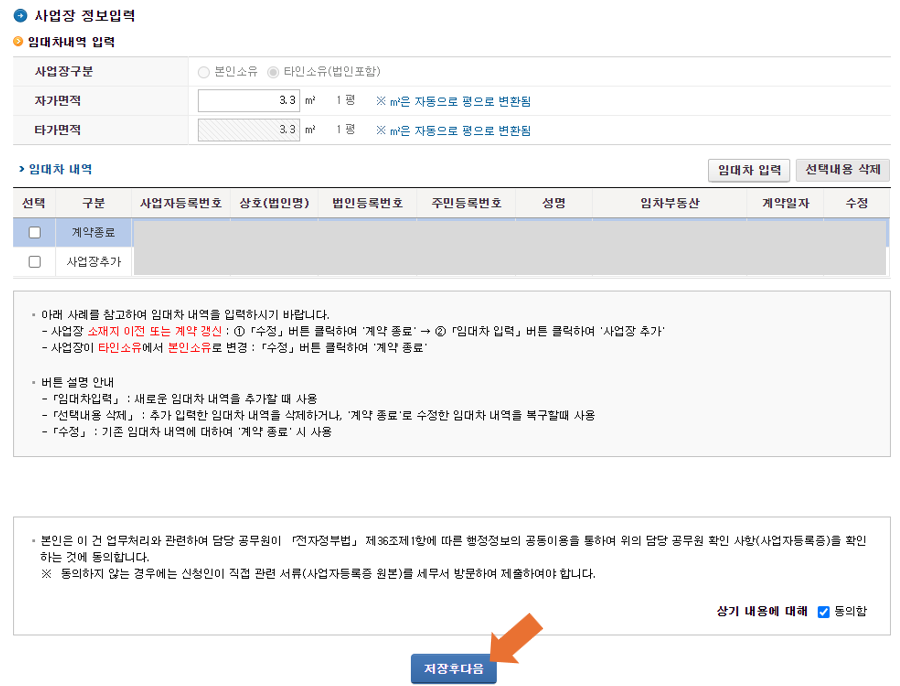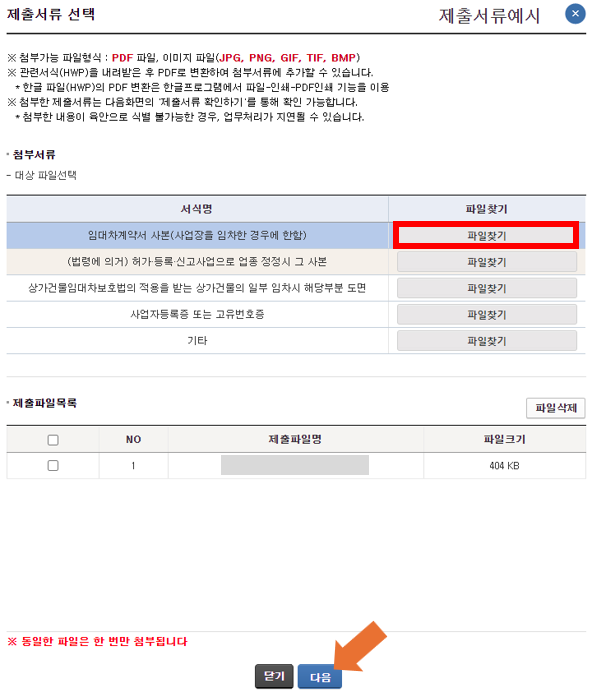 ⑤ 첫 번째 행의 "임대차계약서 사본" 파일찾기를 클릭한 후, 새로운 사업장의 임대차계약서를 등록해 줍니다.