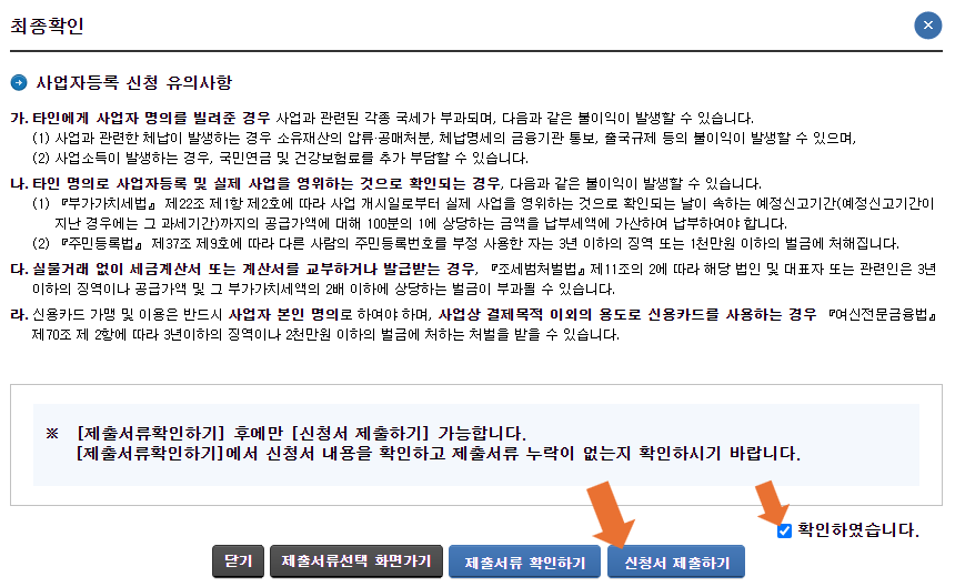 ⑥ "제출서류 확인하기" 버튼을 클릭하여 사업장 주소가 제대로 입력됐는지 재확인합니다.