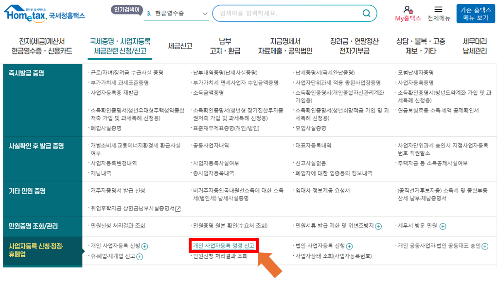 ② 로그인하셨으면, 아래 그림과 같이 "개인 사업자등록 정정 신고" 메뉴를 클릭해 줍니다.